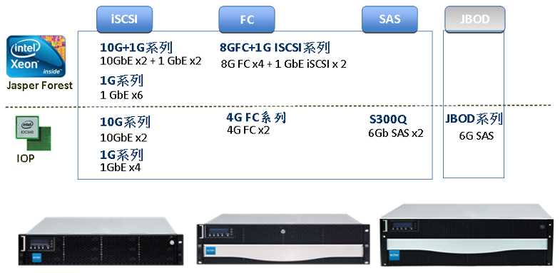 - 安裝容易 ( 透過 iSCSI 、SAS、Fibre 連接 )